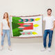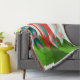 This throw blanket has a Christmas design of candles made of rectangles decorated with stars, ovals, or diamonds with trees grouped around the bottom.
