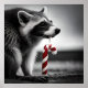 The raccoon is the focal point of the image, and its distinctive facial markings and inquisitive eyes are beautifully highlighted in grayscale. It appears to be focused intently on the candy cane fragment, its nimble paws delicately holding the sugary treat, while its mouth is in the midst of savouring the remnants of the sweet confection.