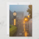 A charming street scene with glowing lamps and decorated shops, softly lit through the evening mist, creating a warm and inviting atmosphere.