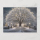 Snow-kissed tree and road under a dusky sky. Falling snowflakes weave a tranquil winter evening. Ideal for Christmas cards. Embrace the season's magic with this enchanting scene.