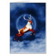 A cheerful Christmas card showing a reindeer flying through the clouds and past the moon. A good card for a business to send.