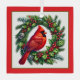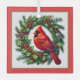 This glass ornament is shown in a square size with a lovely red cardinal on a wreath print. Red border. Multi colour. Personalize with text of name and date. Customize this item with this template or buy as shown.