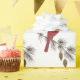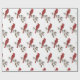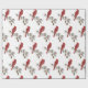 Festive holiday pattern features red cardinal birds on evergreen branches on white background
