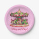 Paper plates in a Christmas holiday themed carousel in peppermint stripes of pink and white, accented with green, and the capttion "Merry and Bright"