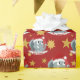 Christmas wrapping paper with an illustration of a cute elephant with red Santa cap; great decoration for Christmas holidays, editable template design with custom field for your own text, with a red background with stars, illustrated by Radka Kavalcova