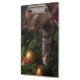 Design features a photograph of a cat reaching for a decoration on a Christmas tree.