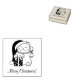 Smiling white cat in a traditional Christmas hat holding a large wrapped present is wishing everyone a very merry Christmas! In its left paw the cat is holding high a bell with a bow.