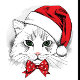 Illustration of a white cat wearing a red Santa hat and a red bow tie with white polka dots, the cat has green eyes and a pink nose, the style is black and white sketch with red accents, the background is white.