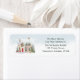 Christmas card address label. Lovely snow covered house with Christmas decorations.