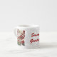 White espresso cup with a vintage 1940s image, on both sides, of jolly Saint Nick with a bag full of toys and bringing Christmas cheer in snowfall. Customizable holiday sentiment. See matching candy jar, flask, mug, pitcher, paper plate, shot glass, teapot and coasters. See the entire Holiday Mug collection in the FOOD/BEV | Dishes section.