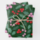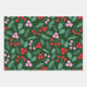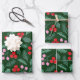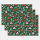 The wrapping paper is a festive amalgamation of classic Christmas symbols and colours. On a deep green background, a repeating pattern showcases delicately interwoven strands of golden tinsel and holly leaves with their bright red berries. Interspersed between these are small, intricately detailed snowflakes, each unique in design, shimmering with a subtle silver foil effect. Generously scattered across this seasonal tapestry are miniature illustrations of Santa's sleigh, reindeer in mid-flight, and cozy little cottages with smoke rising from their chimneys, suggesting the warmth of a fireplace within. The overall look captures the essence of Christmas, inviting the anticipation of unwrapping and the joy of the holiday season.
