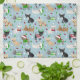 Cute Christmas Chihuahua dogs with black, tan, cream, blue and grey coats dressed in festive holiday outfits, Santa hats and argyle sweaters with scattered Christmas ornaments pattern.