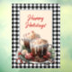 Stylish Holiday window cling for home or business features black and white buffalo plaid border with a duet of festive cocoa cups in watercolor illustration and customizable red "Happy Holidays" text