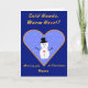 The card features a drawing of a smiling snowman with a black hat and sticks for arms ("cold hands"), black coal eyes and buttons, and a glowing red heart ("warm heart"). He stands against a snowy pale blue background, inside a golden heart frame surrounded by royal blue.