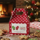 "Christmas Cookie Exchange" party favor box with cute Christmas oven mitts illustration and red and white polka dots design. Digital illustration by Kristine Lee. For more, visit www.kristineleedesigns.com