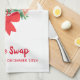 This Cookie Swap kitchen towel is decorated with a watercolor wreath of Christmas cookies and seasonal greenery.