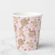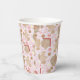 This adorable Christmas paper cup features a pink and white striped background with gingerbread boy, girl, and house cookies, as well as chocolate chip cookies, star sugar cookies, peppermint candies, and candy canes.