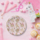 This adorable Christmas paper plate features a pink and white striped background with gingerbread boy, girl, and house cookies, as well as chocolate chip cookies, star sugar cookies, peppermint candies, and candy canes.