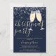 An elegant Christmas party invitation featuring champagne glasses, snowflakes and signature script name. This stylish invitation can be personalized with your information in chic lettering on a winter blue background. Designed by Thisisnotme©