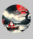 This minimalist t-shirt depicts a serene Japanese winter landscape with whimsical touches like Santa in a boat and a snowman on the moon, rendered in red, black, and white.
