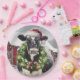 A cow wearing a Santa hat and a festive wreath with glowing lights stands in a snowy farmyard with a red barn in the background