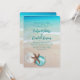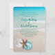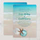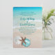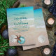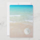 Christmas wedding in a tropical location. Use as a Christmas cruise wedding, or other. Tropical seas and beach sand is the background for four text templates in black script. A white sand dollar, brown sea star (starfish) and aqua blue tree ornament decorate the bottom of the stationery. The back also has a sea and sand image.