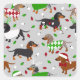 Cute Christmas dachshund dogs with black, tan and dapple coats dressed in festive holiday outfits, Santa hats and argyle sweaters with scattered Christmas ornaments pattern.