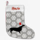 Christmas stocking with a holiday snowflakes pattern and a black dachshund silhouette wearing a Santa hat featuring your pet's name in red script.