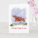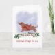 This is a Christmas card showing a dachshund running through the snow in place of dashing through the snow. There is a sweet village with trees and houses nestled on the hill with snow falling.