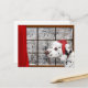 Dalmatian dog wears a Santa hat and looks out the window at the snow waiting for Christmas and watching for Santa dog lovers Christmas holiday greeting card