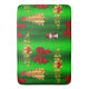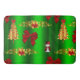 A cute Christmas design featuring a pattern of Christmas decorations including gold Christmas trees, gold holly and red berries, red silk bows and an adorable snowman dressed in red velvet top hat and vest, all on a green background to add some Christmas cheer to your home over the holidays.