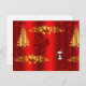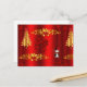 A cute Christmas postcard in red featuring a festive pattern of golden Christmas trees, gold holly with red berries and a cute little snowman dressed in red velvet vest and top hat.