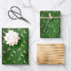 This holiday wrapping paper assortment features patterns of gold faux foil antlers and leaping deer on green distressed backgrounds, along with a gold faux foil satin stripe pattern.