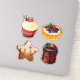 This charming and colourful illustration set features four classic Christmas sweets. The individual graphics include a Red Velvet Cupcake with a raspberry, a Fruit Tart topped with berries, a smiling Gingerbread Star cookie, and a mini Chocolate Christmas Pudding Cake. These vibrant, detailed graphics are perfect for creating holiday sticker sheets, gift tags, baking party invitations, or any product celebrating Christmas treats and sweets.