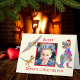 Time for a prehistoric psychedelic Christmas with these Funny dinosaurs in Santa hats and ‘Santa’s Little Helper’ Xmas quote with a child’s name and photo to personalize this colourful Card. Better make sure you’re not in the naughty category or these scary dinos will be after you. T Rex, velociraptor and pterodactyl festive dinosaur humour with cute Santa hats is the perfect way to bring fun and laughter to your family and friends. Original Artwork created by artist Catherine Sweetman