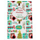 Cartoon dogs, a dog house, a Holiday tree, and a brightly wrapped gift make a cute pattern on this Christmas gift bag. In addition, there is colourful text that says "Feliz Navi-Dog", "We Woof you a Merry Christmas", and "Santa Paws". Personalize the white banner lined in red on the front. Holiday fun! *Clip art used in this design is copyrighted by Encore Software, Inc., which permits use to its licensors. All rights reserved.