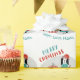 Cute hound type breed cartoon dog, wearing a blue sweater and red knitted hat with a red doodle wrapped gift. Set on a mid-century modern style cloud background with white starburst style snowflakes. Merry Christmas in matching blue and red font lettering. Personalize with your message in blue font.