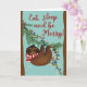 This is a Christmas card with a sloth hanging on a pine branch wearing a striped red and white scarf. Christmas lights are strung across the branch and the text says ‘eat, sleep and be merry!’