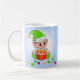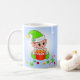 Modern cute green Christmas elf with gift box, Christmas balls, candy cane and star on light blue background Christmas Mug. Name can be personalized.