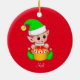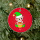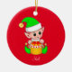 Cute Christmas elf holding a gift box on red Ceramic Ornament.