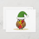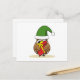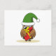 An illustration of a shy happy elf owl with green santa hat and red present with yellow ribbon. This cute cartoon design is a gift idea for owl lovers, bird lovers, and fantasy or magical movie lovers. Are you excited to receive your gift on Christmas?