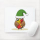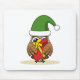 An illustration of a shy happy elf owl with green santa hat and red present with yellow ribbon. This cute cartoon design is a gift idea for owl lovers, bird lovers, and fantasy or magical movie lovers. Are you excited to receive your gift on Christmas?