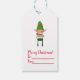 Christmas Elves gift tag design features a cute elf on front with the words, "Merry Christmas!" below. Two lines are displayed below for writing who the gift is to and from. Back features the words, "You made the NICE list!" Elves are dressed in green, words are in red. Designed to coordinate with the Christmas Elves gift wrap.