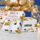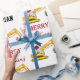 A cute illustration of a yellow toy excavator wearing a Santa hat and decorated in Christmas lights digging up some Christmas gifts with words "Merry Christmas" and your custom name. Perfect for construction truck lovers of all ages. An ideal Christmas wrapping paper for excavator truck enthusiasts big or small, girls or boys. Customize the name and make it your own.