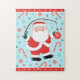 Fishing Christmas holiday puzzle featuring Santa Claus fisherman, holding a fishing rod with an ornament on the hook, surrounded by Christmas candy.