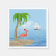 Pink flamingo with Santa cap and Christmas palm tree in beach sand with boat and ocean water.