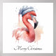 watercolor painting of a pink flamingo wearing a blue winter hat in christmas style