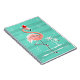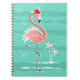 Stylish design with a retro touch featuring a festive pink flamingo wearing a red Santa hat, stars and palm trees decorated with baubles set against a striped aqua background. A customizable design for you to personalise with your own text, images and ideas. An original digital art image created by Quirky Chic.