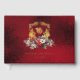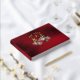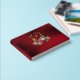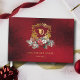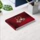 Timeless and elegant yet festive holiday-themed wedding guest book design featuring classic hand-drawn gold foil floral crest accented by a colourful spray of red and white Christmas flowers and evergreens. This custom formal template includes editable text fields as well as an opulent, ruby red velvet texture background.