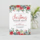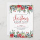 Red roses winter foliage and pinecones Christmas floral border frame. Customizable Christmas dinner invitation.